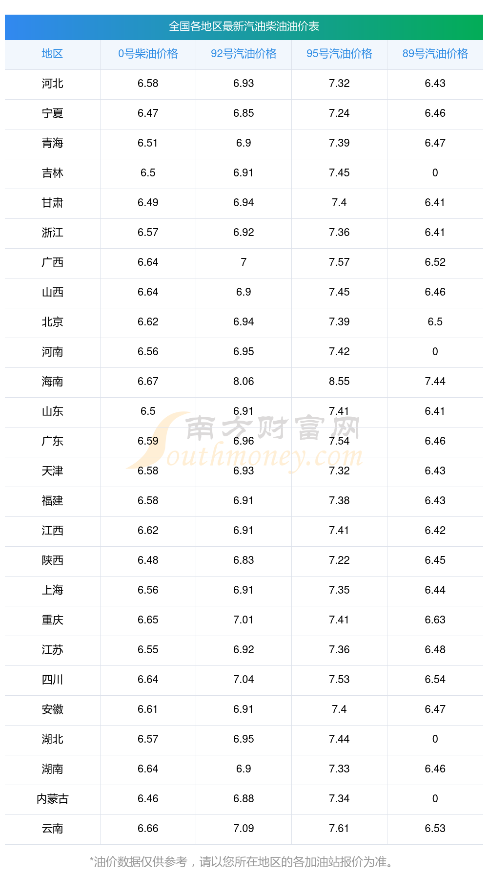 油價數(shù)據(jù)僅供參考,請以您所在地區(qū)的加油站報價為準(zhǔn)。南方財富網(wǎng)發(fā)布此信息的目的在于傳播更多信息,對使用該油價信息所導(dǎo)致的結(jié)果概不承擔(dān)任何責(zé)任。