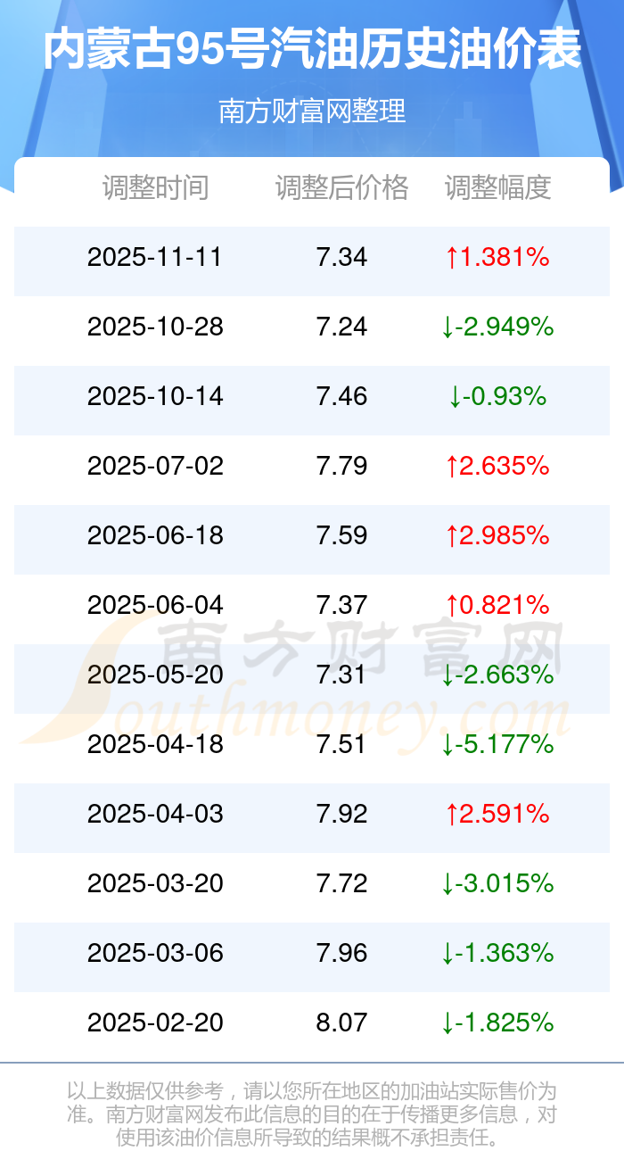 11月13日,內(nèi)蒙古95號汽油的價(jià)格是7.34元每升,本次的調(diào)整時(shí)間為11月11日,對比上次的調(diào)整增了0.1元,增1.381%,下次調(diào)整時(shí)間為11月24日24時(shí),還有11.25天。
