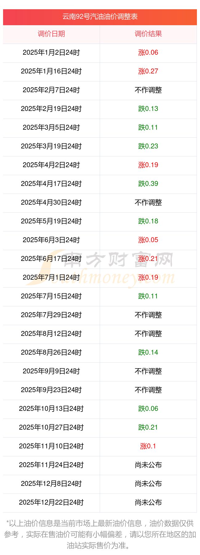 2025年云南澄江油價(jià)調(diào)整日歷時間表