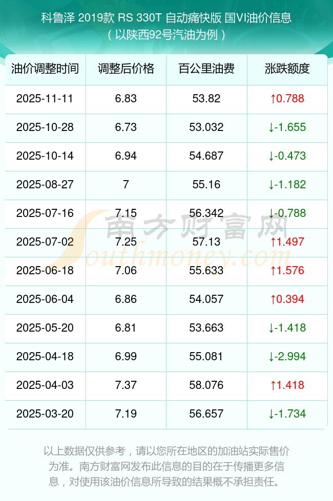按11月11日92號汽油最新調(diào)整價格6.83元每升來計算(以陜西為例),該車型百公里平均油費為53.82元,按上一輪10月28日調(diào)整價格6.73元每升來計算,百公里平均油費為53.032元,對比上一輪多花0.788元,下一輪油價調(diào)整時間為11月24日24時。