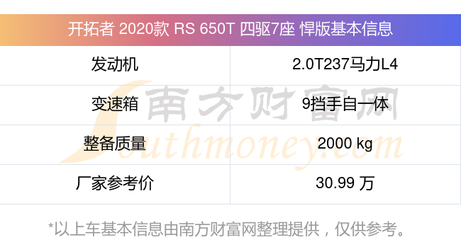 開拓者 2020款 RS 650T 四驅(qū)7座 悍版動力方面,搭載的是一臺2.0T237馬力L4渦輪增壓發(fā)動機,匹配9擋手自一體自動檔變速箱,燃料形式為汽油,常規(guī)整備質(zhì)量2000kg,廠家參考價30.99萬元。