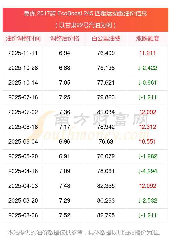 根據(jù)11月11日92號(hào)汽油最新調(diào)整價(jià)格6.94元/升來計(jì)算(以甘肅為例),該車型每百公里的平均油費(fèi)是76.409元,上一輪10月28日調(diào)整價(jià)格6.83元每升來計(jì)算,每百公里的平均油費(fèi)是75.198元,對(duì)比上一輪多花1.211元,下一輪的油價(jià)調(diào)整時(shí)間是11月24日24時(shí)。