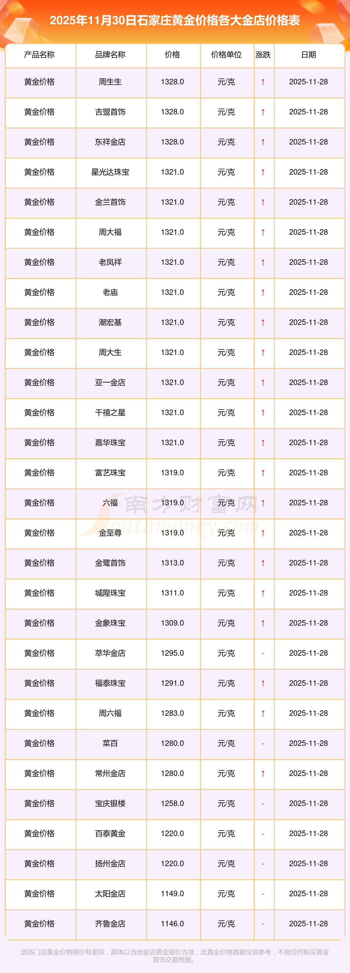 2025年11月30日,石家莊星光達(dá)珠寶、星光達(dá)珠寶、寶泉錢(qián)幣、金蘭首飾、金蘭首飾、謝瑞麟、謝瑞麟、謝瑞麟、謝瑞麟、謝瑞麟、金銀街等各大金店品牌黃金價(jià)格今日價(jià)格如下:星光達(dá)珠寶1321.0元/克、星光達(dá)珠寶600.0元/克、寶泉錢(qián)幣12.6元/克、金蘭首飾1321.0元/克、金蘭首飾600.0元/克、謝瑞麟1207.0元/克、謝瑞麟1321.0元/克、謝瑞麟46370.0、謝瑞麟13970.0、謝瑞麟41860.0、金銀街1296.0元/克。