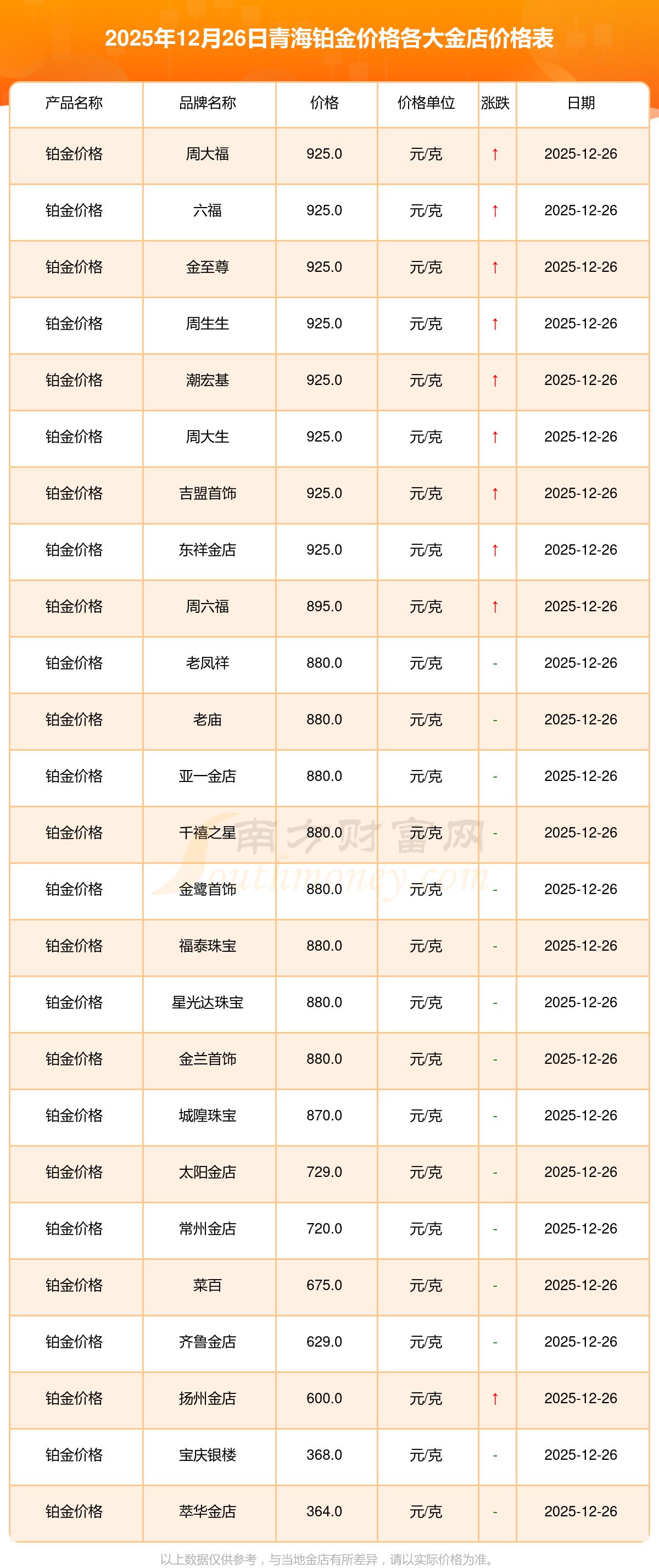 2025年12月26日青海周大福、老鳳祥、老廟、周生生、周大福、周大福、周大福、周大福、周大福、周大福、老鳳祥等各大金店品牌鉑金價(jià)格最新價(jià)格如下:周大福黃金價(jià)格1398.0元/克,老鳳祥黃金價(jià)格1413.0元/克,老廟黃金價(jià)格1413.0元/克,周生生黃金價(jià)格1407.0元/克,周大福鉑金價(jià)格925.0元/克,周大福飾品金價(jià)(內(nèi)地)1413.0元/克,周大福黃金飾品(香港)50280.0,周大福鉑金價(jià)格(香港)27110.0,周大福金條價(jià)格(香港)45210.0,周大福金條金價(jià)(內(nèi)地)1239.0元/克,老鳳祥鉑金價(jià)格880.0元/克。