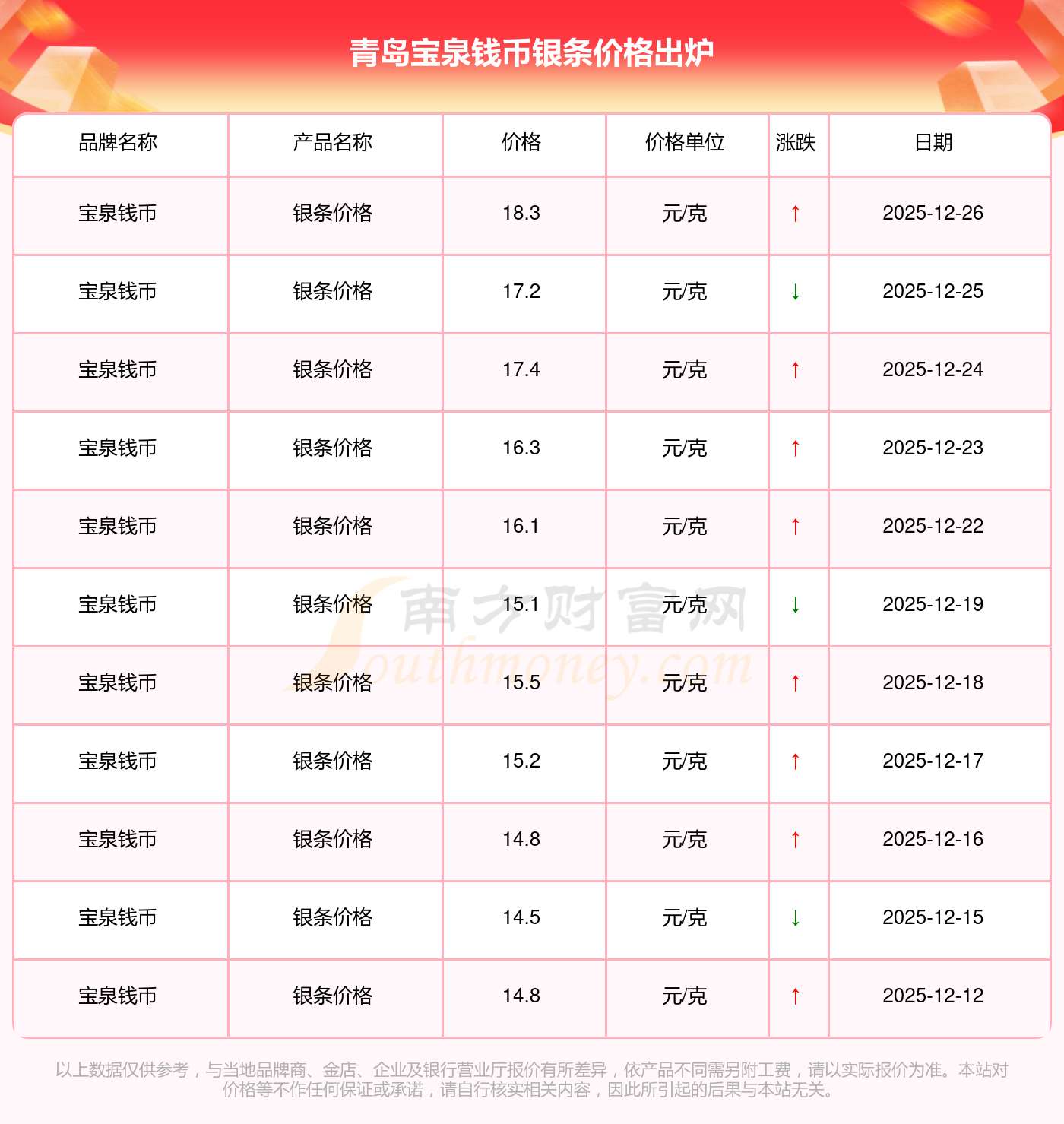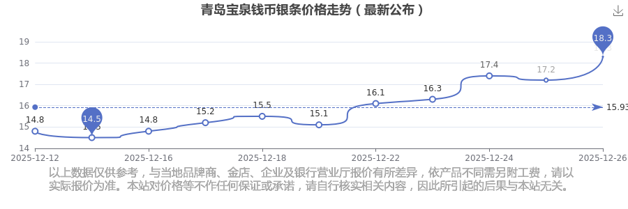 今日2025年12月26日,青島寶泉錢幣銀條價(jià)格為18.3元/克。